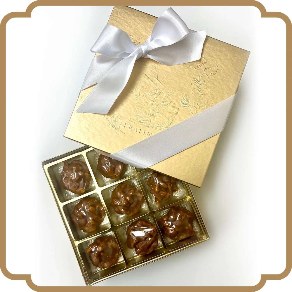 The our gold candy gift box  comes in the single, double, or triple layer variety and is always finished off with a gorgeous seasonal ribbon.  It is available in Mini Creamy Original Pralines, Mini Chocolate Pralines, Mini Vanilla Pralines, Mini Chewy Pralines, Mini Coconut Pralines, or an assortment.
