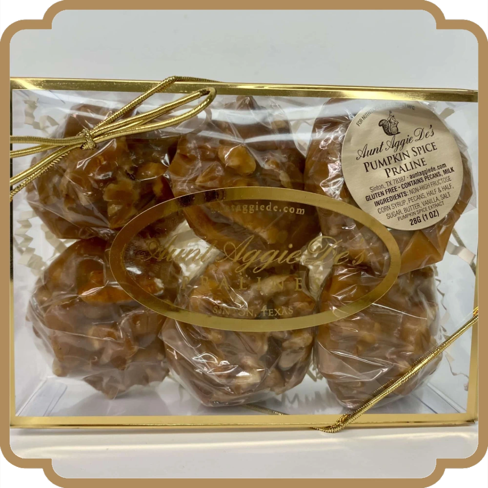 A clear box with gold trim and gold ribbon of 6 Pumpkin Spice Pralines (1 oz.). The Pumpkin Spice Praline is as  fabulous as our Chewy Praline but it’s all pumpkin spiced up for the season and made with salted roasted pecans. Guaranteed to satisfy your fall cravings!