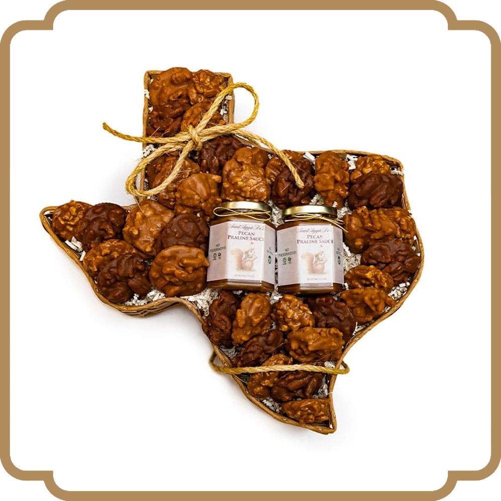 Each Texas-shaped basket is made in the USA and filled with 1 jar of Pecan Praline Sauce, 1 jar of Hot Fudge Sauce, and an assortment of Original Creamy, Chewy, Chocolate, and Vanilla Pralines, for a total of 3 dozen 2 oz. pralines. This gift basket makes a Texas-sized impression! (Ribbon may be substituted for rope embellishment.)