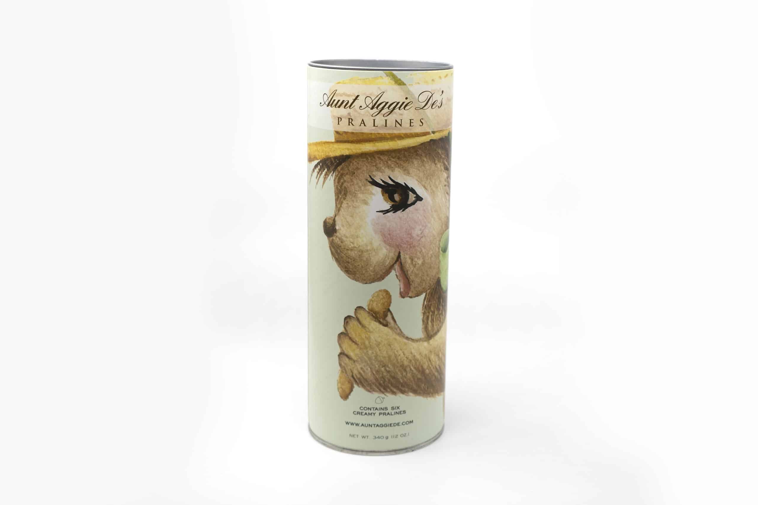 This all occasion, adorable tube of six large (2 oz) Creamy Original Pralines highlights Agnes in all her charismatic glory! Wearing her signature boater hat, Agnes has a real close-up and star role in this production! Filled with 12 oz of pure pecan candy delight, this gift will make the recipient as happy as Agnes herself!
